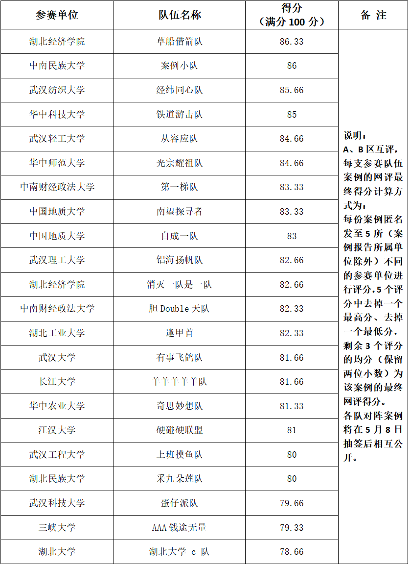 在联盟各单位的共同努力、共同参与下,本届大赛收到湖北省19家MPAcc培养单位共计44支参赛队伍的案例报告。所有案例报告需要通过大赛组委会查重并达到要求(中国知网查重率低于15%)。大赛案例在4月14日开始网络评审,参赛单位提供专家评委。为使案例大赛的评审更加公平公正,本届大赛的案例评审分A、B区进行互评,A、B区参照第六届大赛执行。A区培养单位组织评委通过网络平台对B区参赛单位的团队案例进行评分,B区培养单位组织评委通过网络平台对A区参赛单位的团队案例进行评分。每份案例送审至五家(案例报告所属单位除外)不同的单位,最终网络评审分数采用“去掉一个最高分,去掉一个最低分,取均分”的方法得出大赛案例评审分即最终得分。按照大赛规则产生进入复赛的二十二支队伍。进入复赛队伍名单如下表: