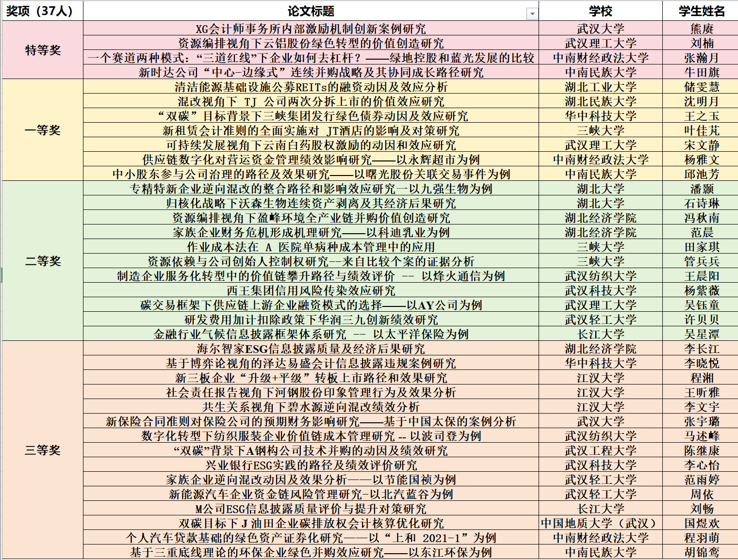 根据湖北省MPAcc优秀学位论文评选办法,经过专家初审及会审,现产生湖北省第一届MPAcc优秀学位论文共计37篇及优秀组织奖3个单位,具体公示如下(排名不分先后):